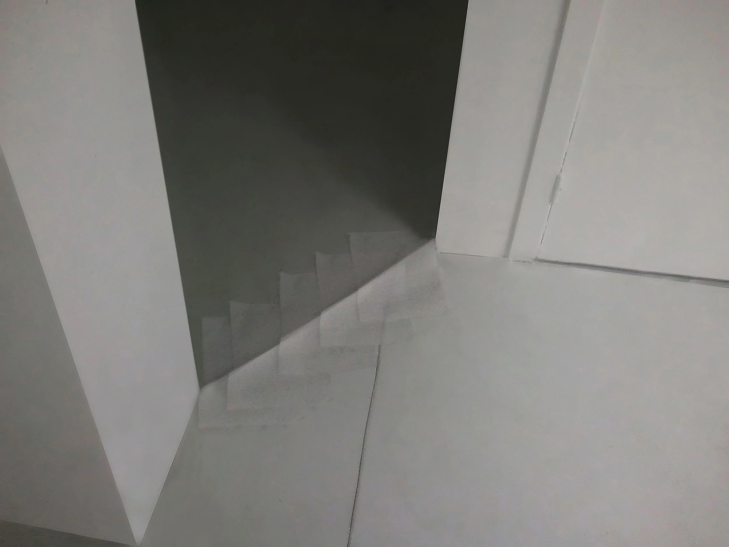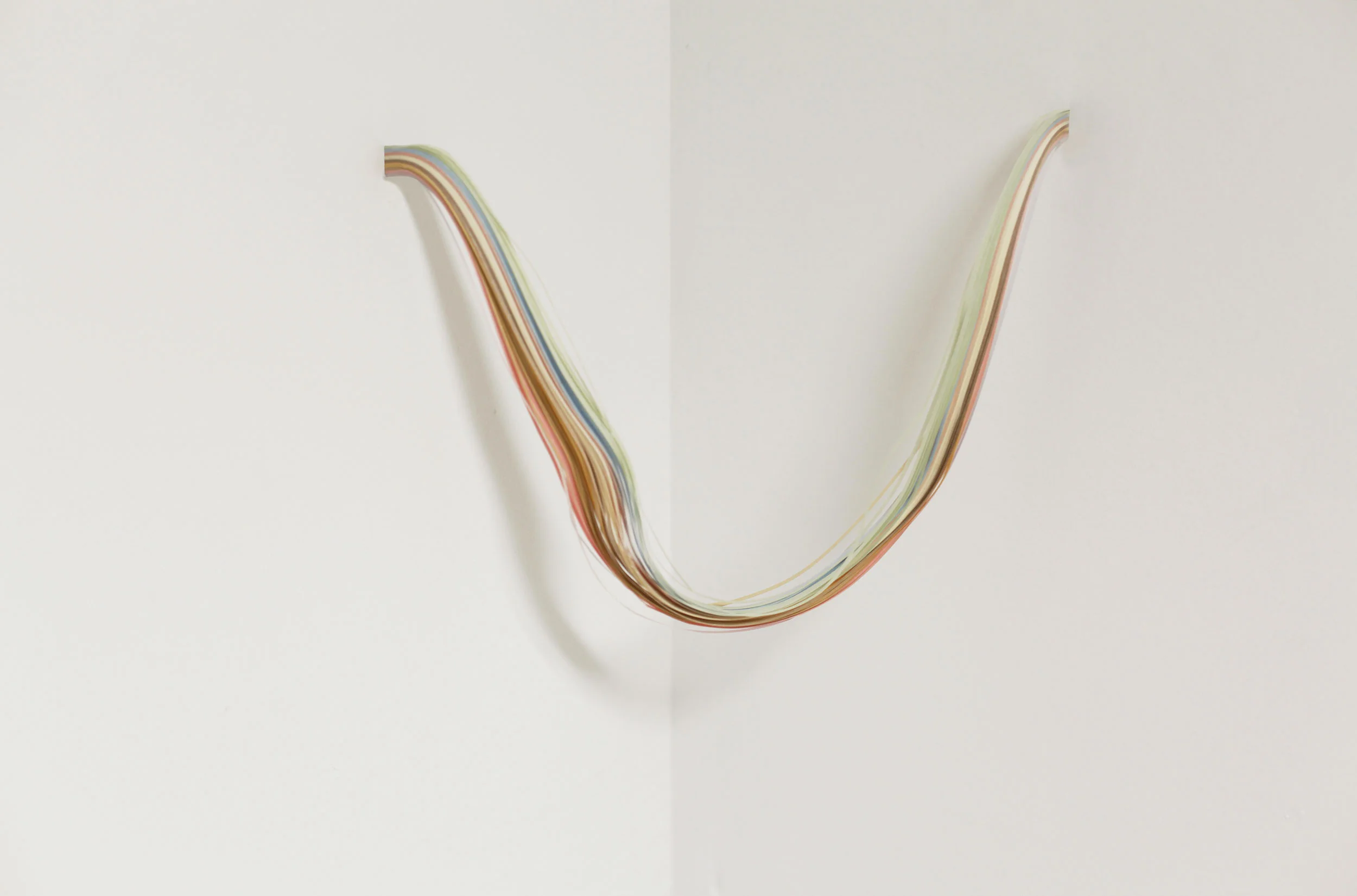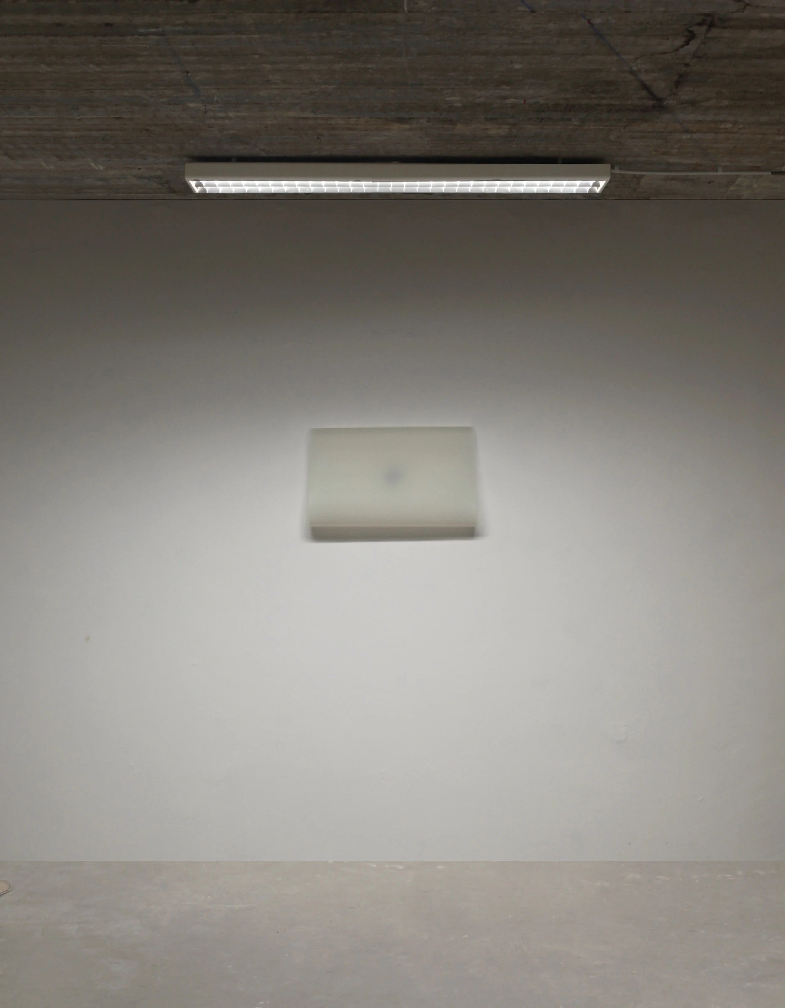 Multiple points of view are proposed to apprehend the same piece, which can only be animated by the move of the spectator. From far, a coloredgrey spot is visible. It’s vanishing while getting closer. This perceptive experience take places with an aware bond.