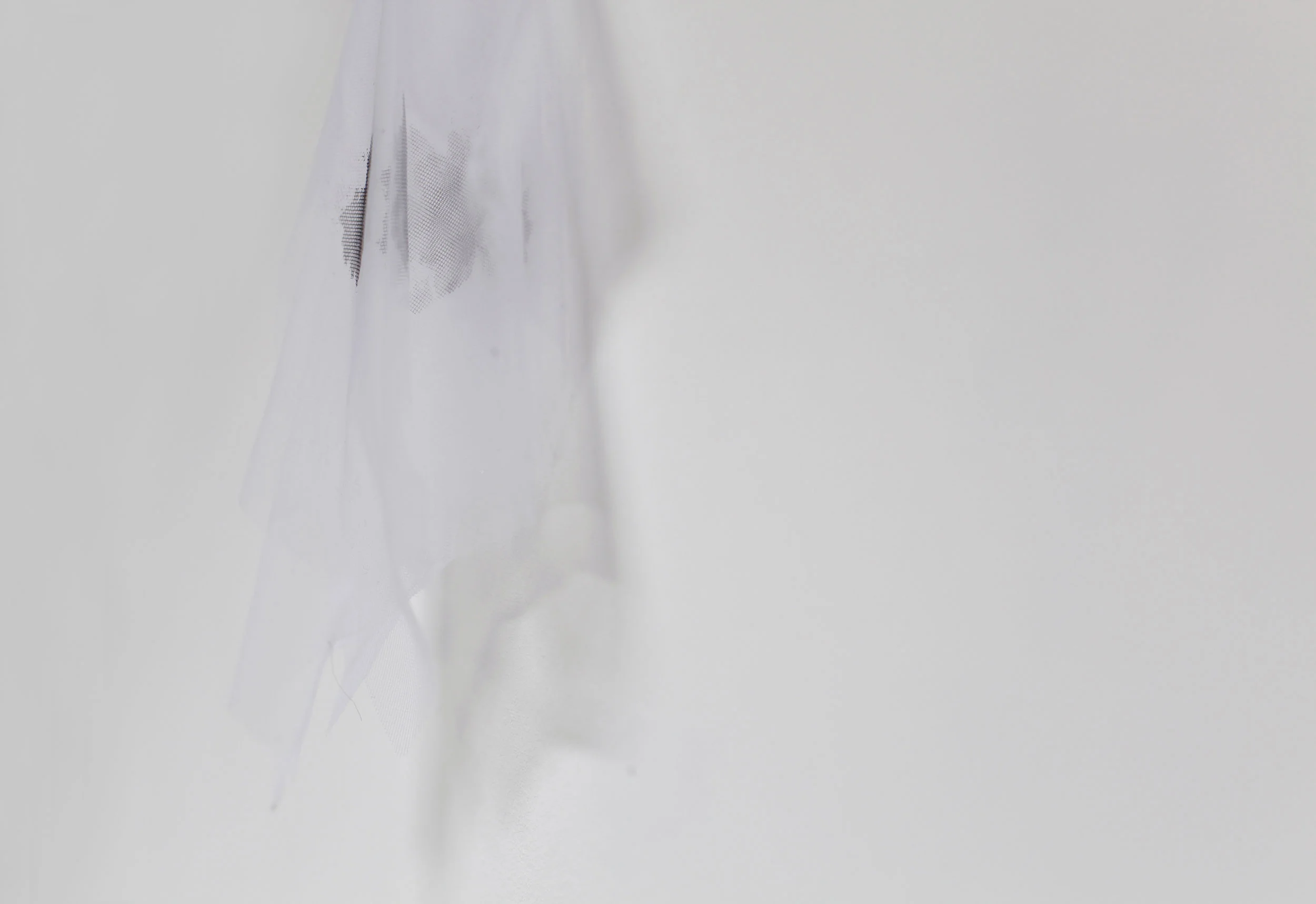 A drawing on a draped thin and transparent fabric which seems melting with its shadow. The ink drops overlapping reach to a fully dark spot.