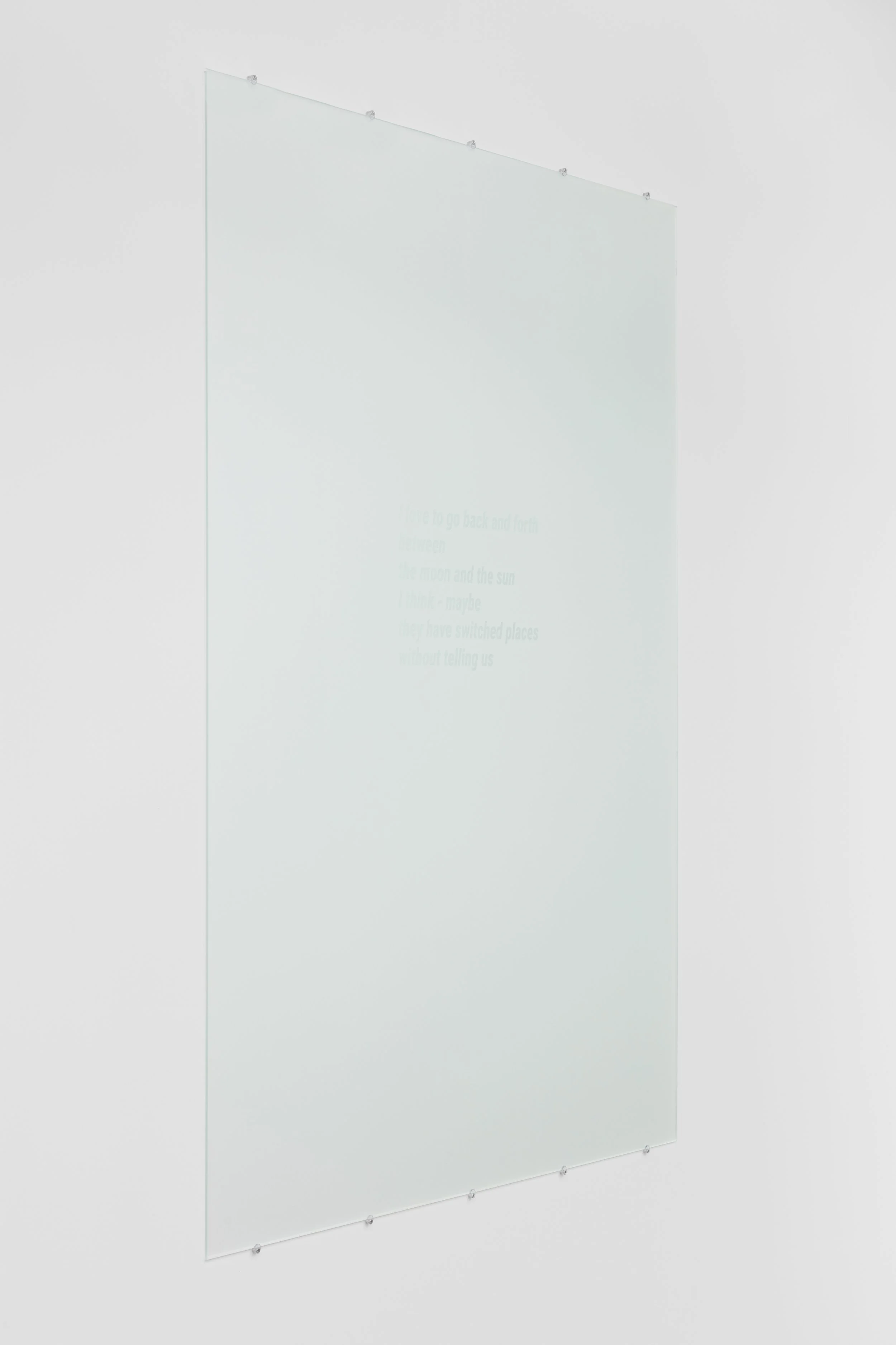 At first glance these series of works appear silent to the point of almost blending with their background. However, while getting closer in search for a favourable angle, matte letters reveal themselves.Thus, depending on each personal experience, these poems either remain imperceptible or are encountered actively and willingly. In contrast with annihilating flows of information and images, this play with perception and attention aims to stimulate our sense of free will. It also embodies my personal relationship to poetry: I constantly oscillate between the need for its depth and emotions and the need for distance and lightness of heart. The three poems explore personal inner experiences beyond language, while referring to gestures commonly experienced at night - such as admiring starry skies.